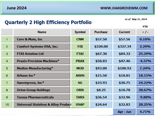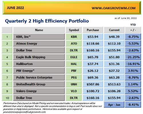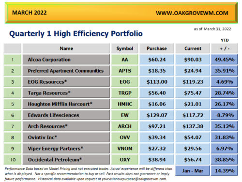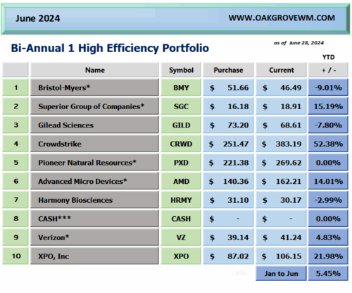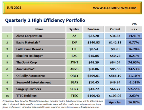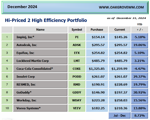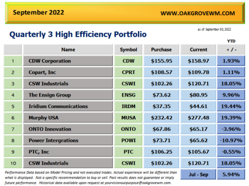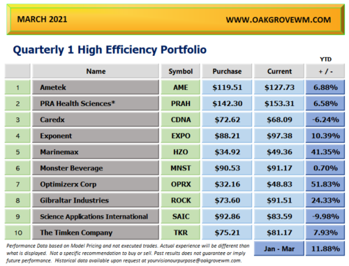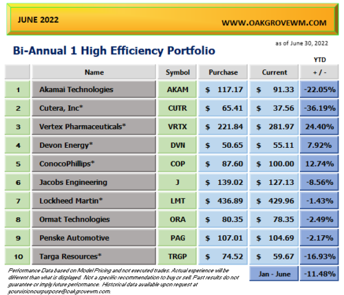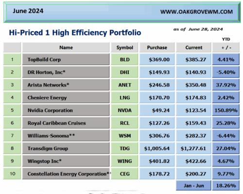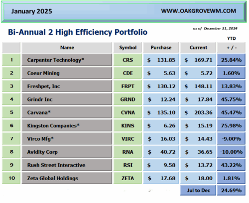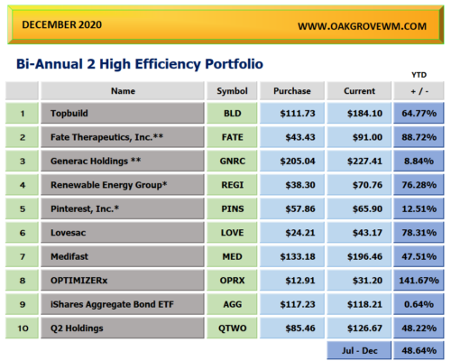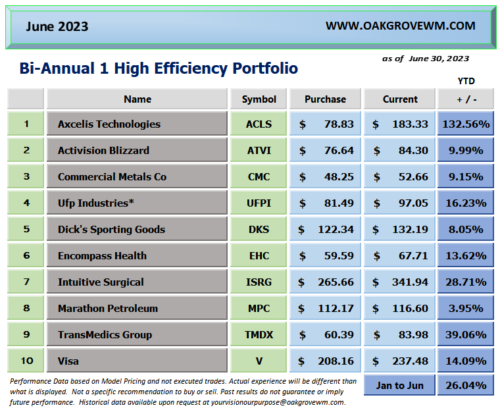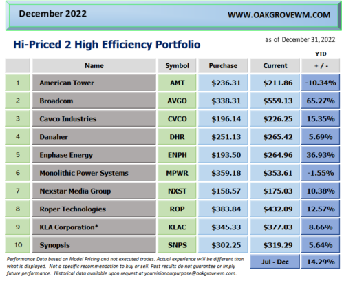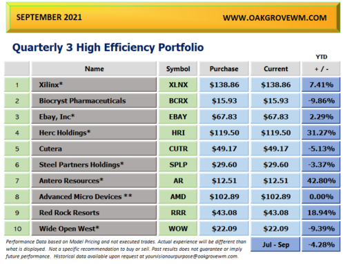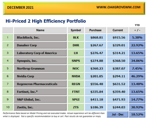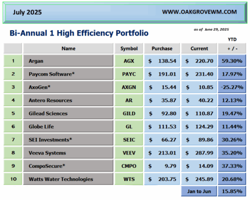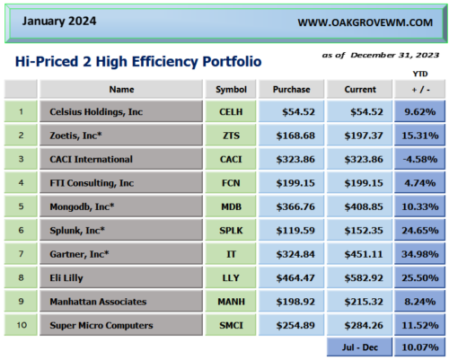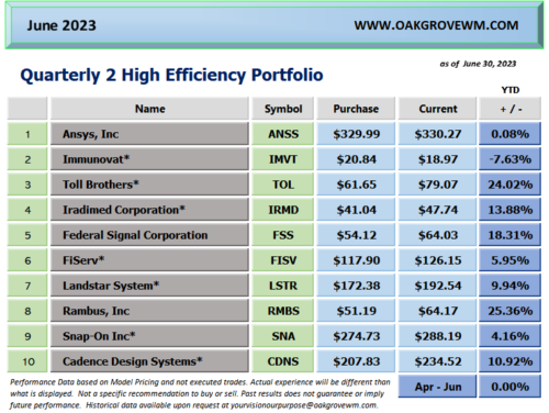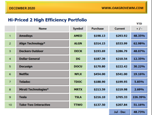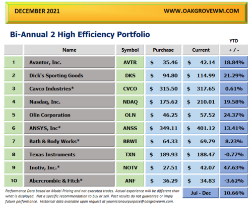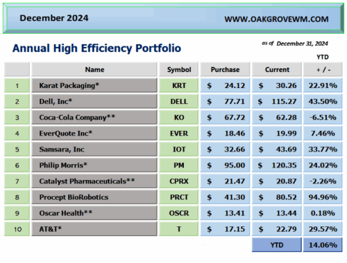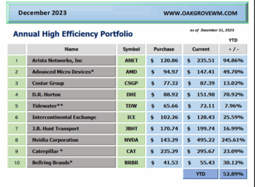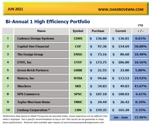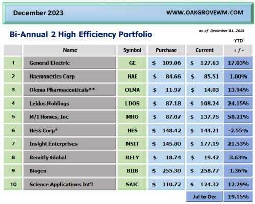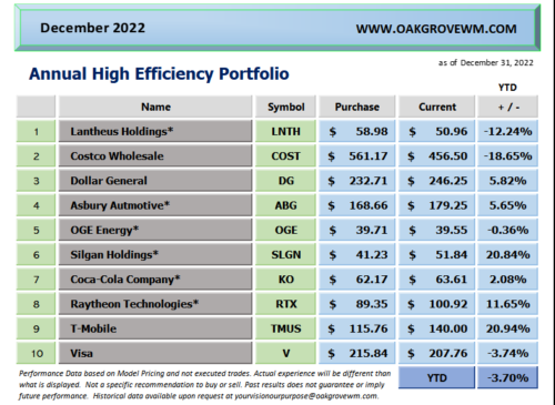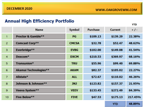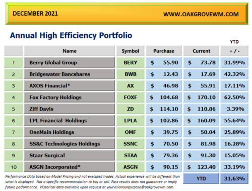 You will find below our archived Stock Listing Holding Reports for each of our High Efficiency Portfolios for the past 5 years. In each Holdings Report, they will show the stocks chosen with their respective begin and end values. For more detailed information, including a Morningstar Report regarding our High Efficiency Portfolios, please contact our office yourvisionourpurpose@oakgrovewm.com.