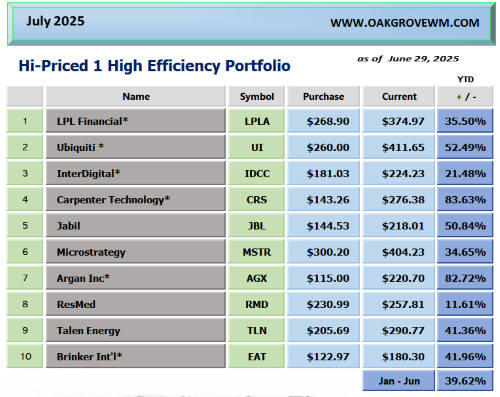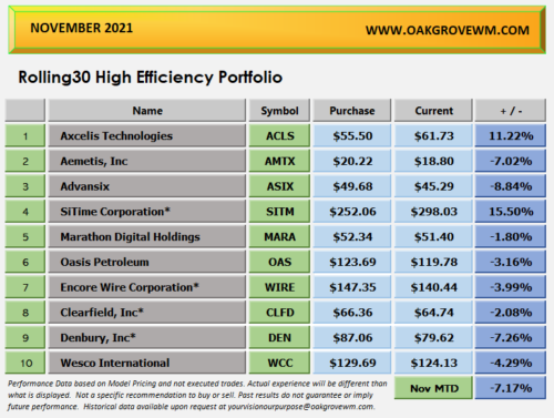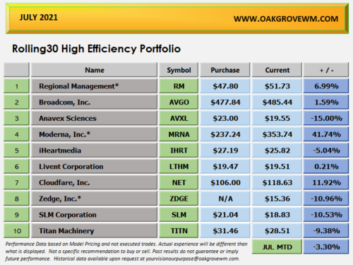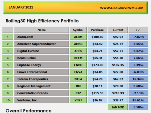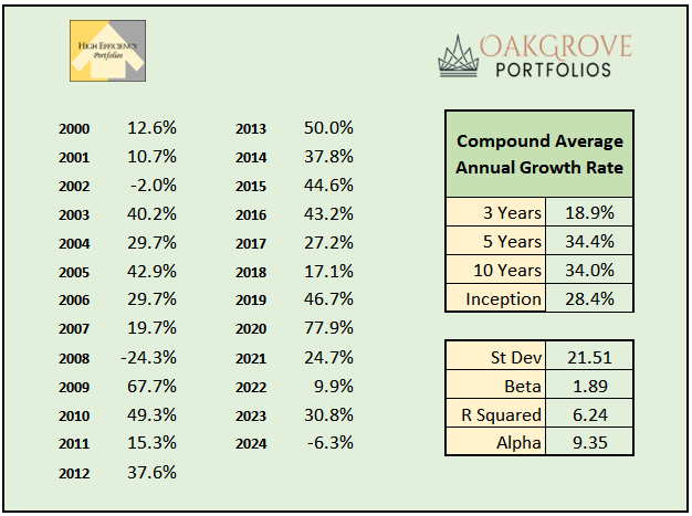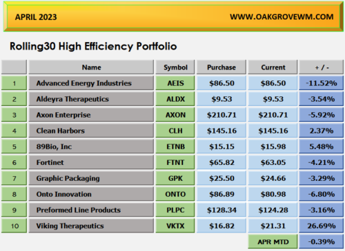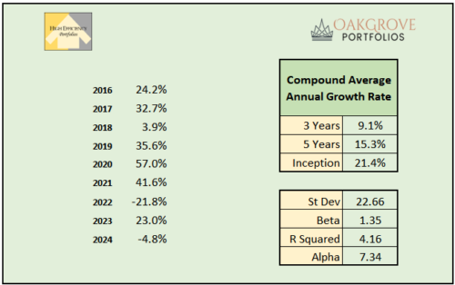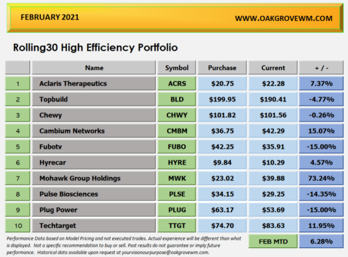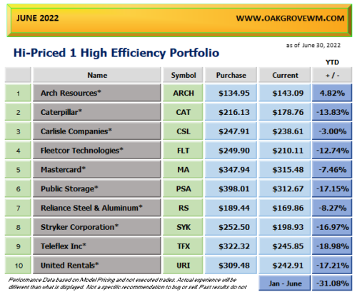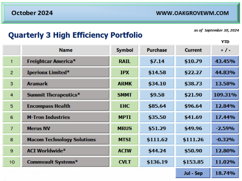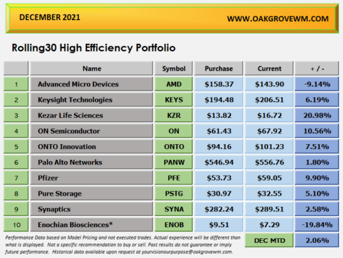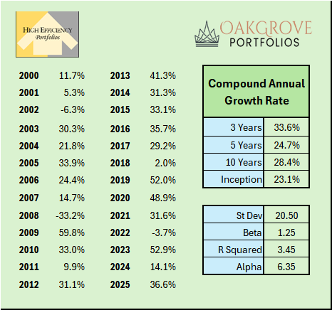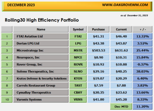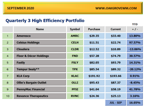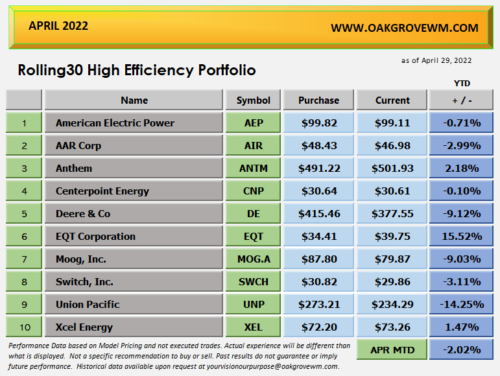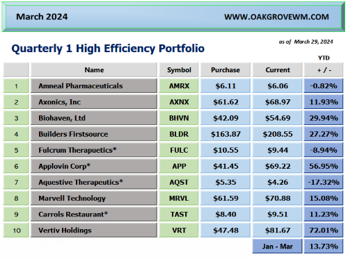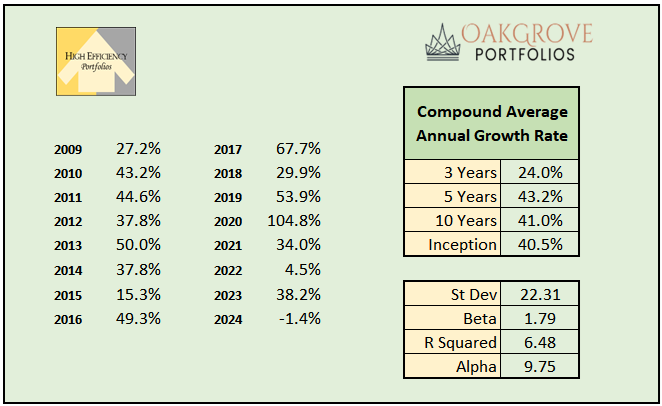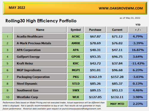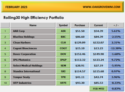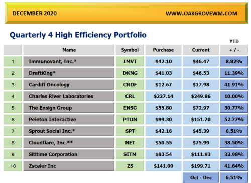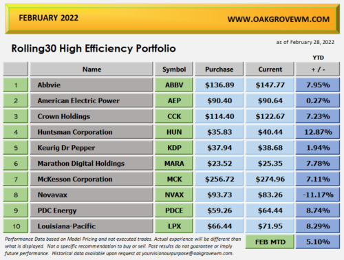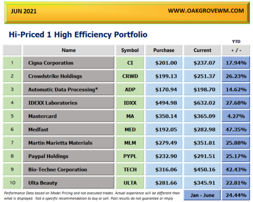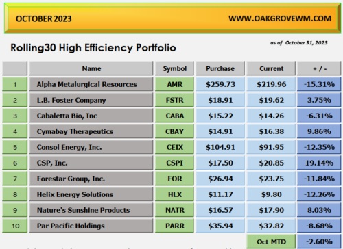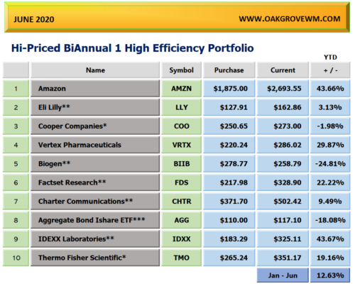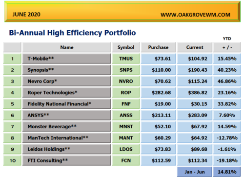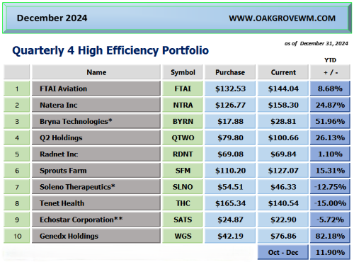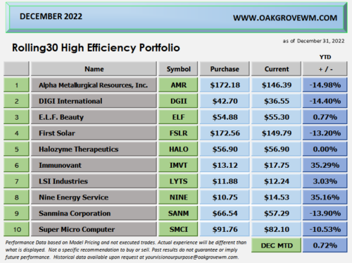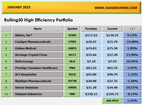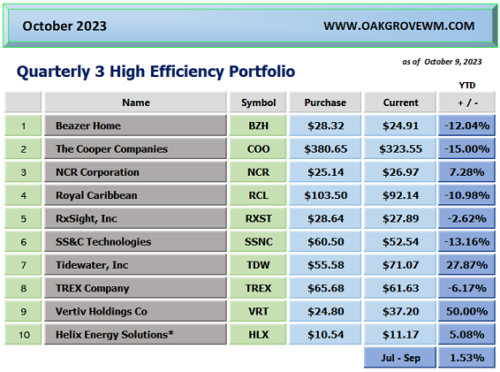 You will find below our archived Stock Listing Holding Reports for each of our High Efficiency Portfolios for the past 5 years. In each Holdings Report, they will show the stocks chosen with their respective begin and end values. For more detailed information, including a Morningstar Report regarding our High Efficiency Portfolios, please contact our office yourvisionourpurpose@oakgrovewm.com.